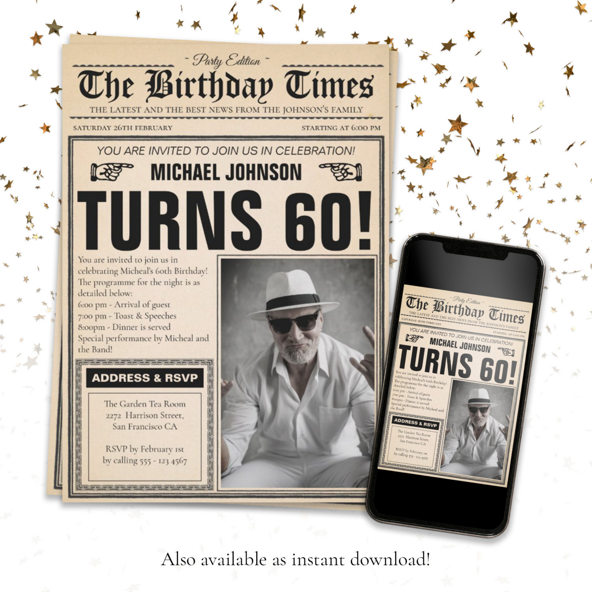 60th Birthday Newspaper Cover Humour Custom Photo Invitation