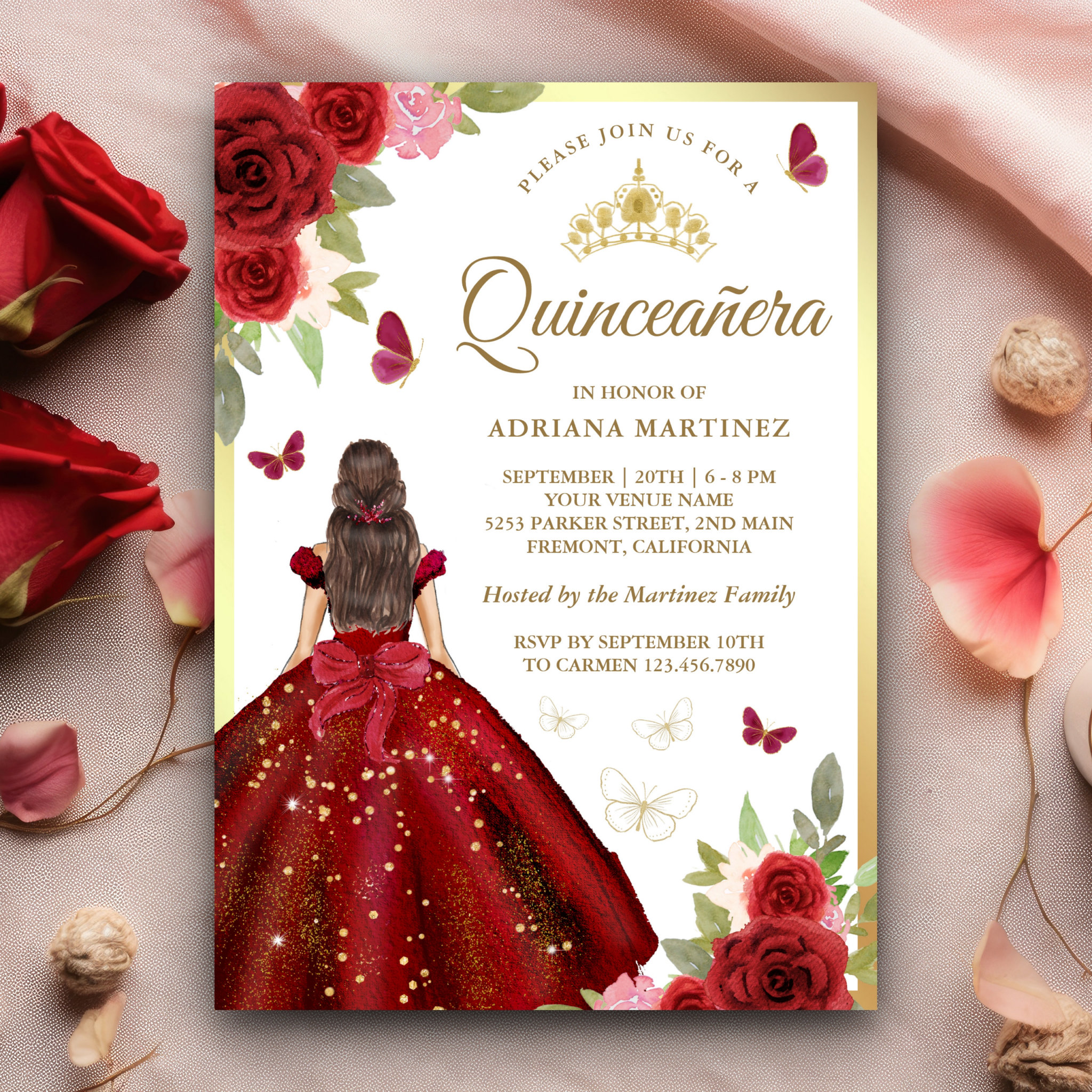 Burgundy Floral Dress Butterfly Quinceanera Invitation