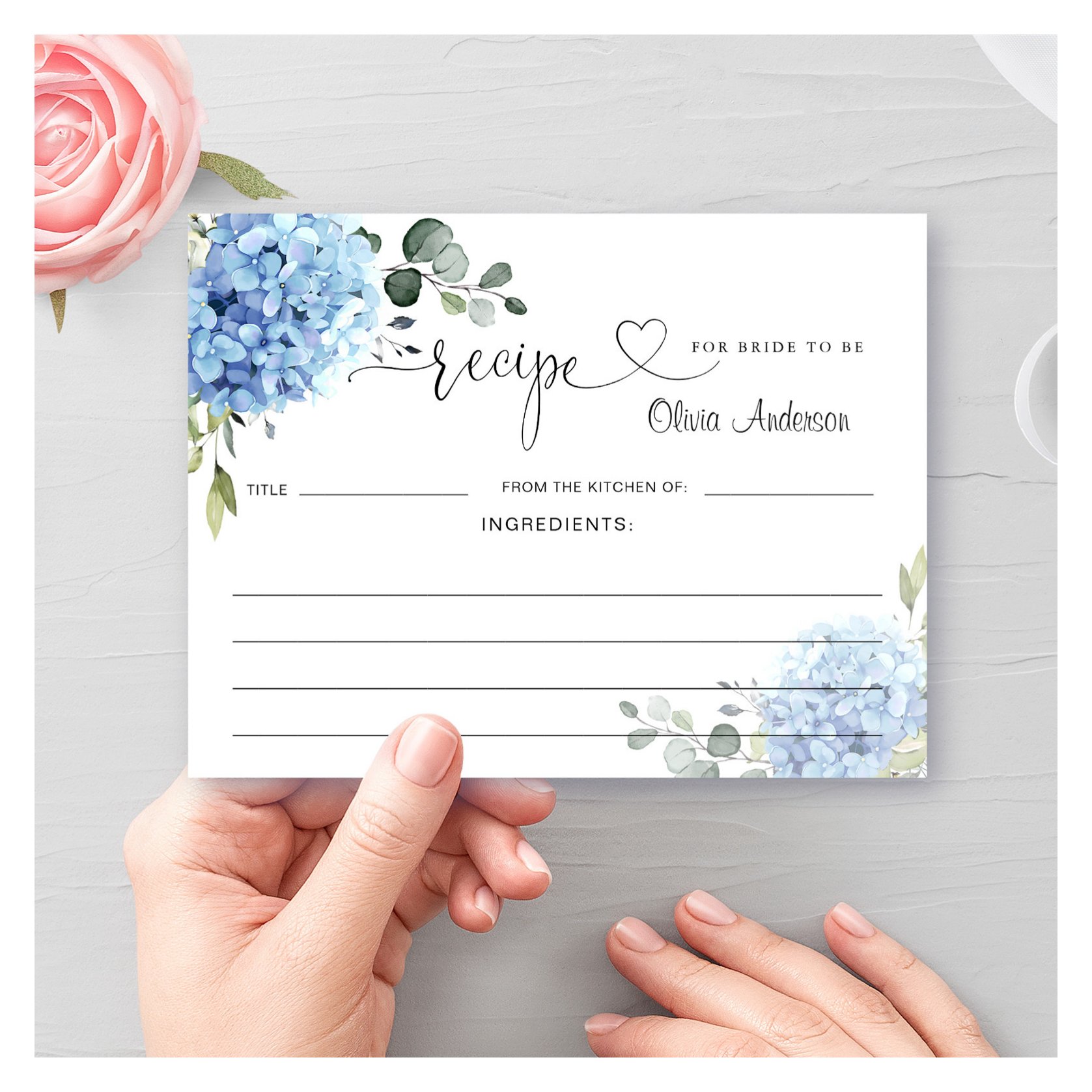 Elegant Blue Hydrangea Bridal Shower Recipe Card