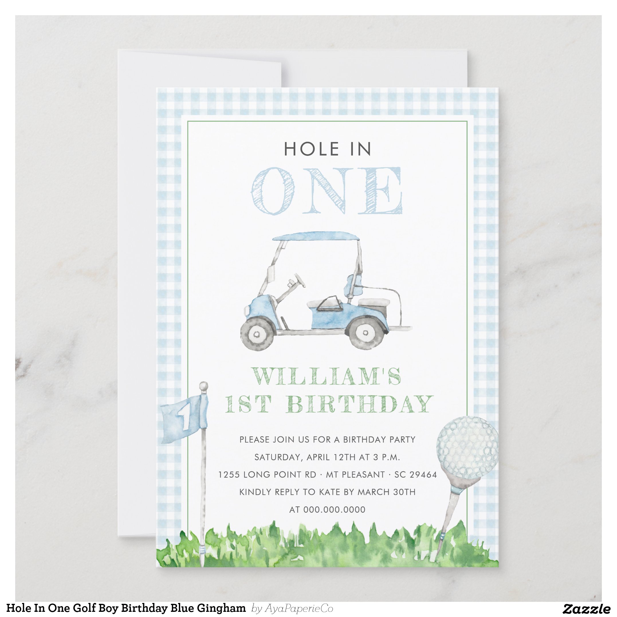Hole In One Golf Boy Birthday Blue Gingham Invitation