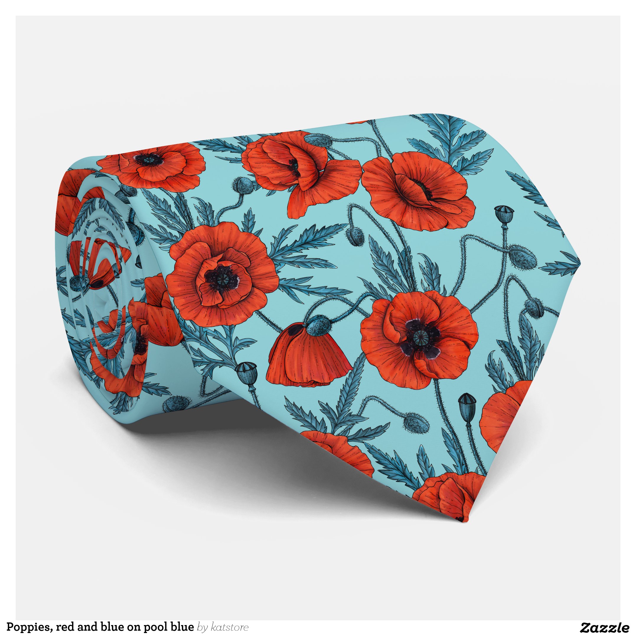Poppies, red and blue on pool blue neck tie