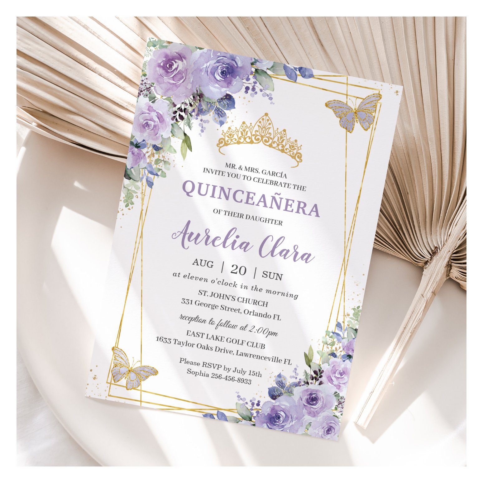 Be the first to review “Quincea?era Purple Lilac Floral Butterflies Tiara Invitation”