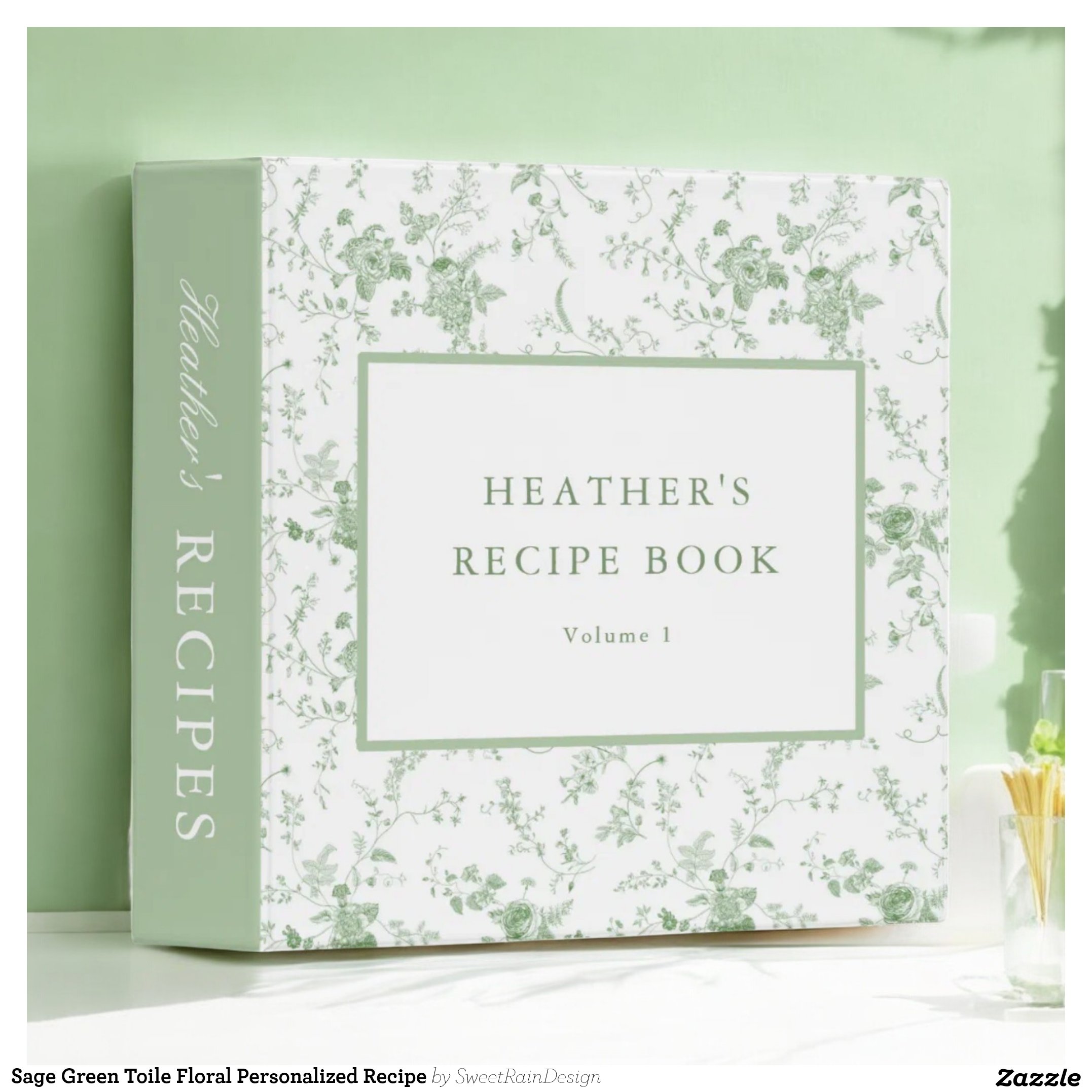 Sage Green Toile Floral Personalized Recipe 3 Ring Binder