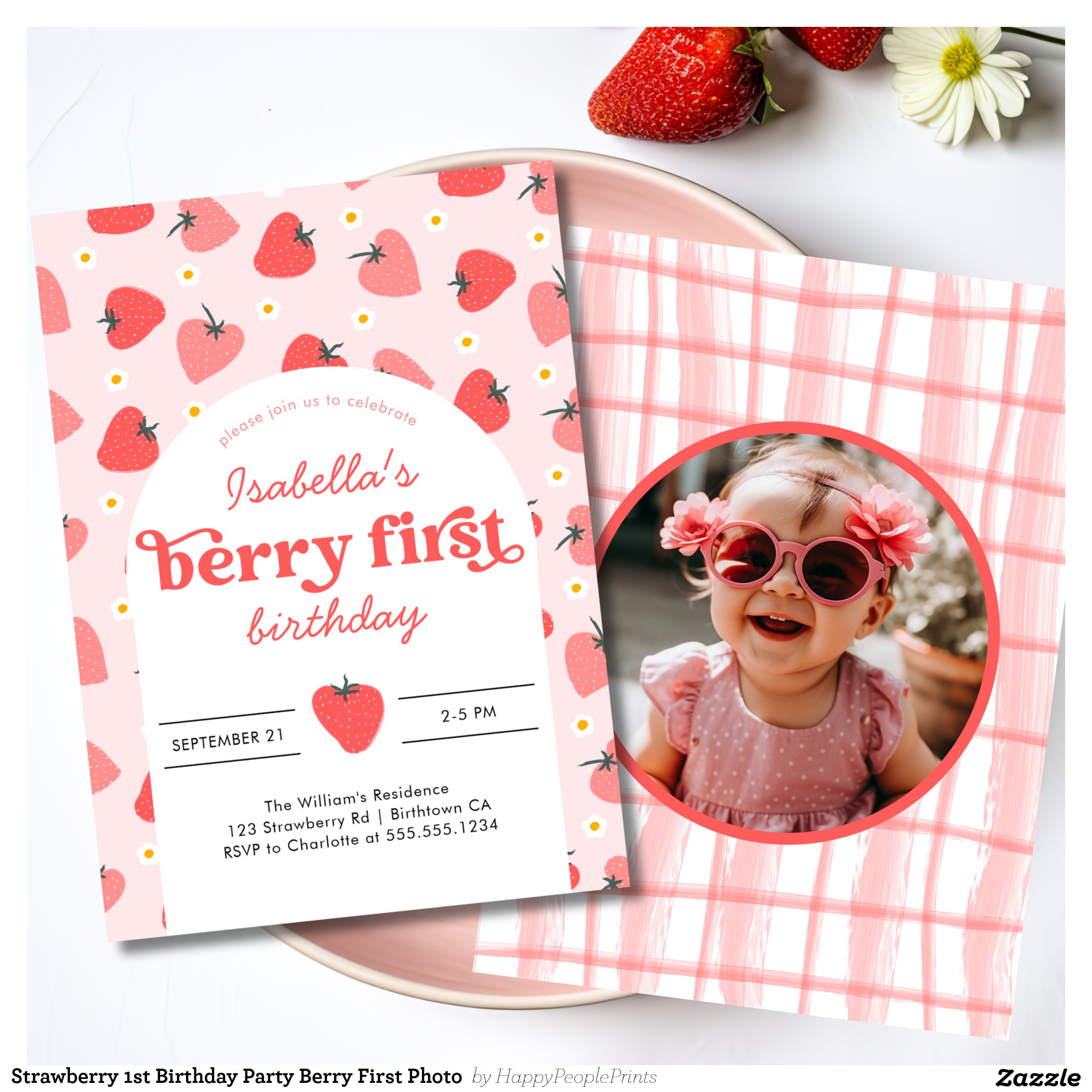 Strawberry 1st Birthday Party Berry First Photo Invitation